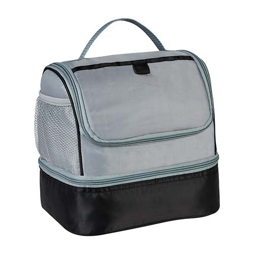 Interior plastificado. Doble compartimento con cierre. Bolsa lateral de red y asa de agarre superior. Capacidad para 9 latas.. Medidas: 24 x 24 x 17 cm . Material: Poliéster