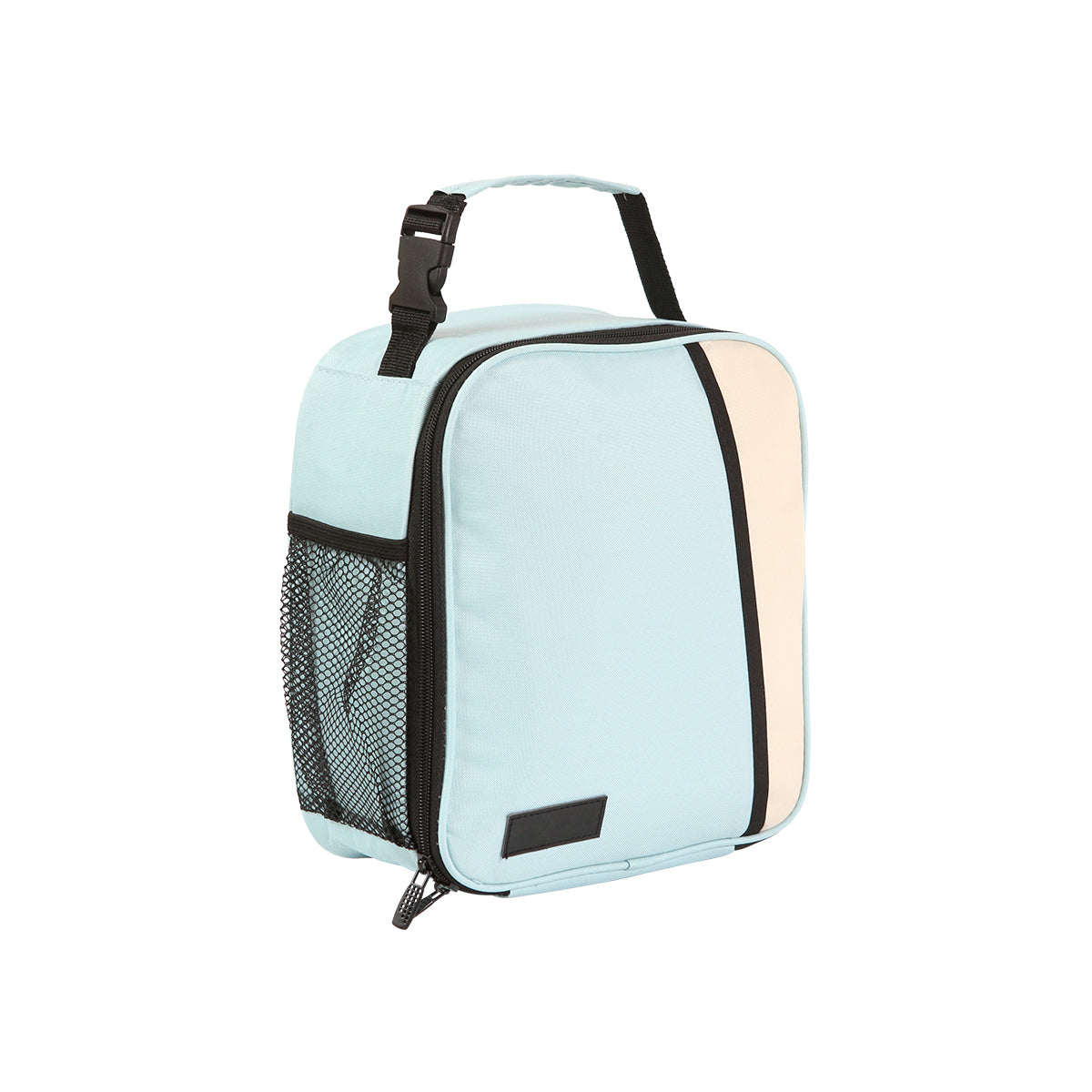 Lonchera térmica fabricada en poliéster y papel aluminio, con cubierta de curpiel y diseño bicolor. Incluye asa con broche ideal para colgarla a tu mochila, cuenta con una bolsa de maya lateral, bolsa frontal y un compartimento principal con cierre metálico. Perfecta para transportar alimentos y conservarlos frescos.