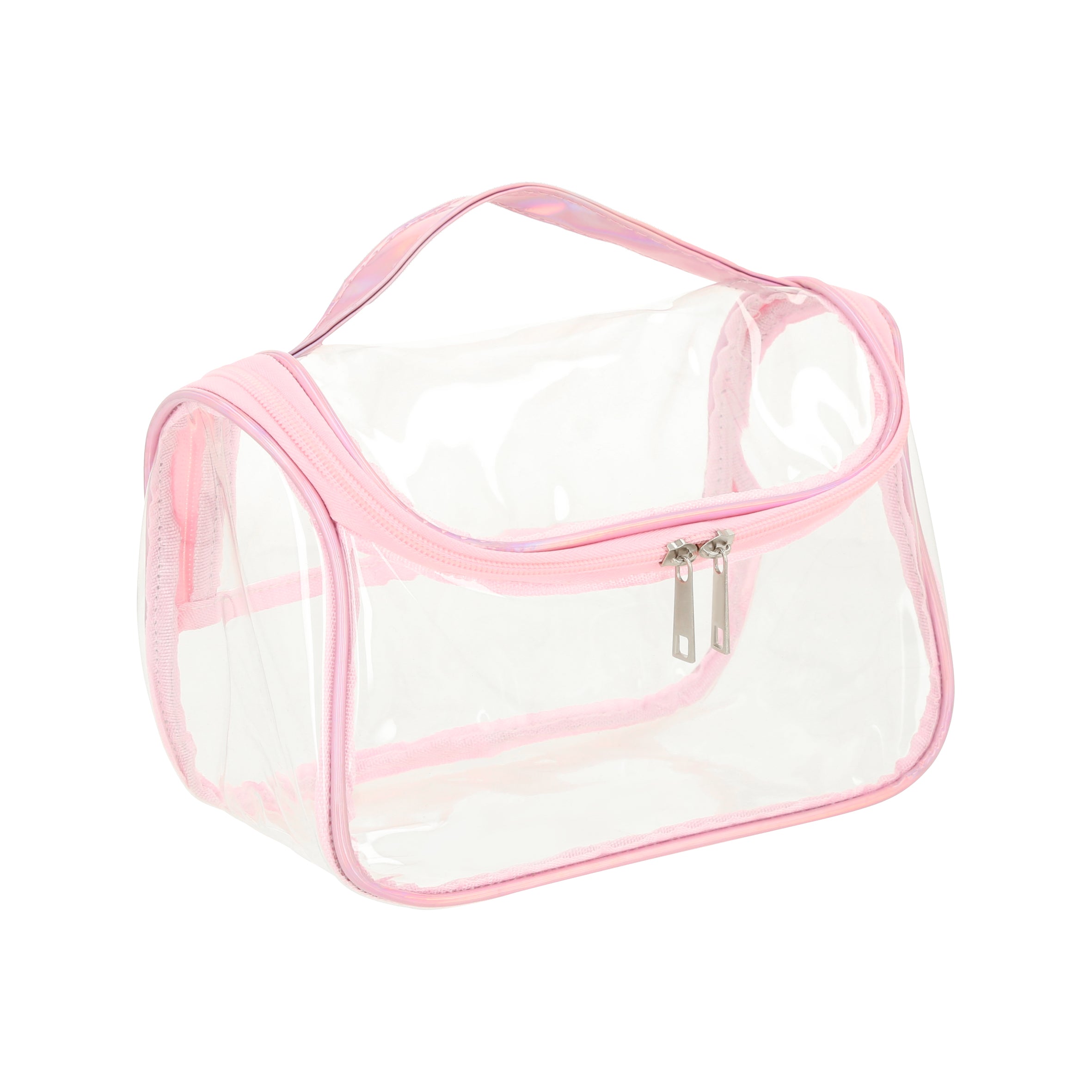 Cosmetiquera de plástico transparente, costuras en color rosa, doble cierre y asa.. Medida producto alto: 20 . Medida producto ancho: 22.3 . Area impresion: 9 x 4 cm