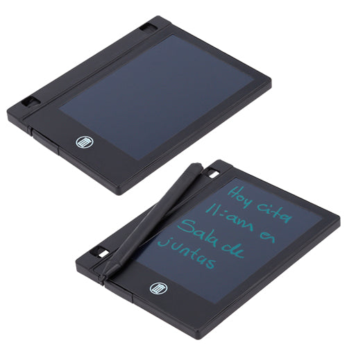 Mini pizarrón digital de plástico, con plumilla, botón para eliminar escritura, botón de bloqueo para evitar la pérdida de información e imán en la parte trasera. Incluye una batería.. Medida producto alto: 11.5 . Medida producto ancho: 9 . Area impresion: 1.5 x 1.5 cm