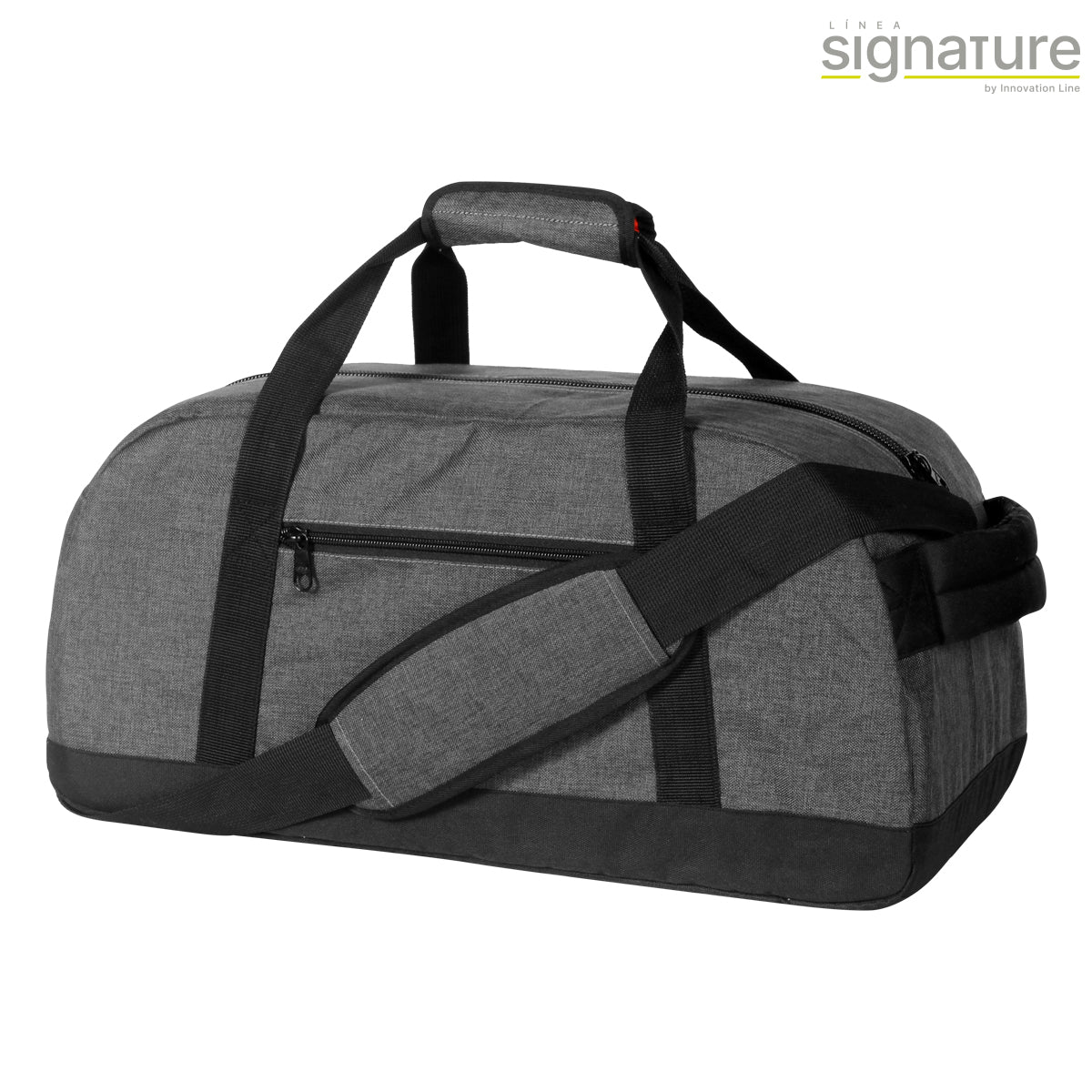 Maleta deportiva fabricada en poliéster color gris, bolsa frontal con cierre, doble asa y correa de hombro ajustable. Super resistente y funcional, ideal para el GYM, viaje, entretenimiento y más.
