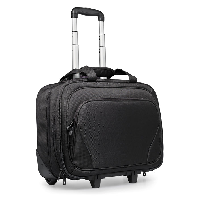 Maleta de carrito para negocios fabricada de poliéster 1680D. Incluye un bolsillo para laptop de 17 y un bolsillo para tableta de 10 con varios compartimentos.