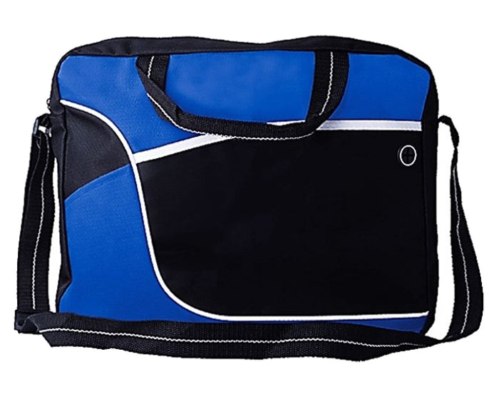 Bolsa tipo maletín en poliéster, asas y correa ajustable. Cuenta con bolsillo externo y salida para audífonos, en dos tonos de tela combinables.