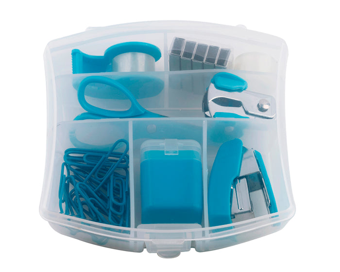Set de escritorio indispensable. Incluye clips para papel, sacapuntas, mini engrapadora, grapas, saca grapas, tijeras, mini despachador de cinta adhesiva y cinta de respuesto. Presentación: estuche de plástico transparente.