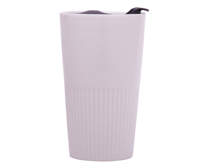 Vaso de cerámica de doble pared con recubrimiento brillante. Tapa de presión con seguro deslizable. CAP. 300 ml. Presentación: caja en color blanco.