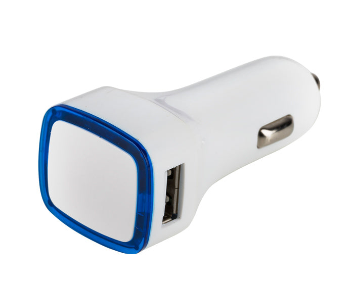 Cargador para automóvil con 2 entradas USB. Fino detalle de color traslúcido en contorno. Voltaje 5.1V, 1A y 2.1A. Presentación: caja en color blanco.