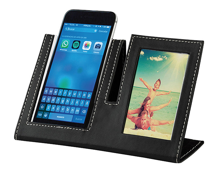 Portarretrato con base para celular y ventana de PVC para insertar foto. Ideal para colocar en escritorio. Presentación: caja en color blanco.