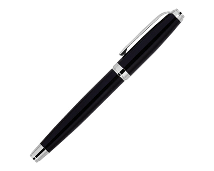 Bolígrafo metálico tipo roller con tapa de rosca, recubrimiento liso de color. Presentación caja en color negro