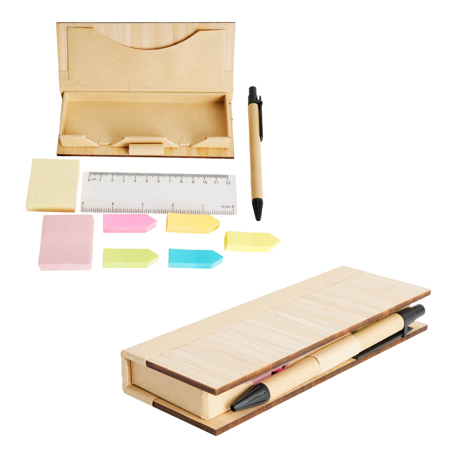 Set ecológico de bambú con notas y banderas adhesivas. Incluye bolígrafo y regla.. Medida producto alto: 6 . Medida producto ancho: 15.6 . Area impresion: 10 x 3 cm