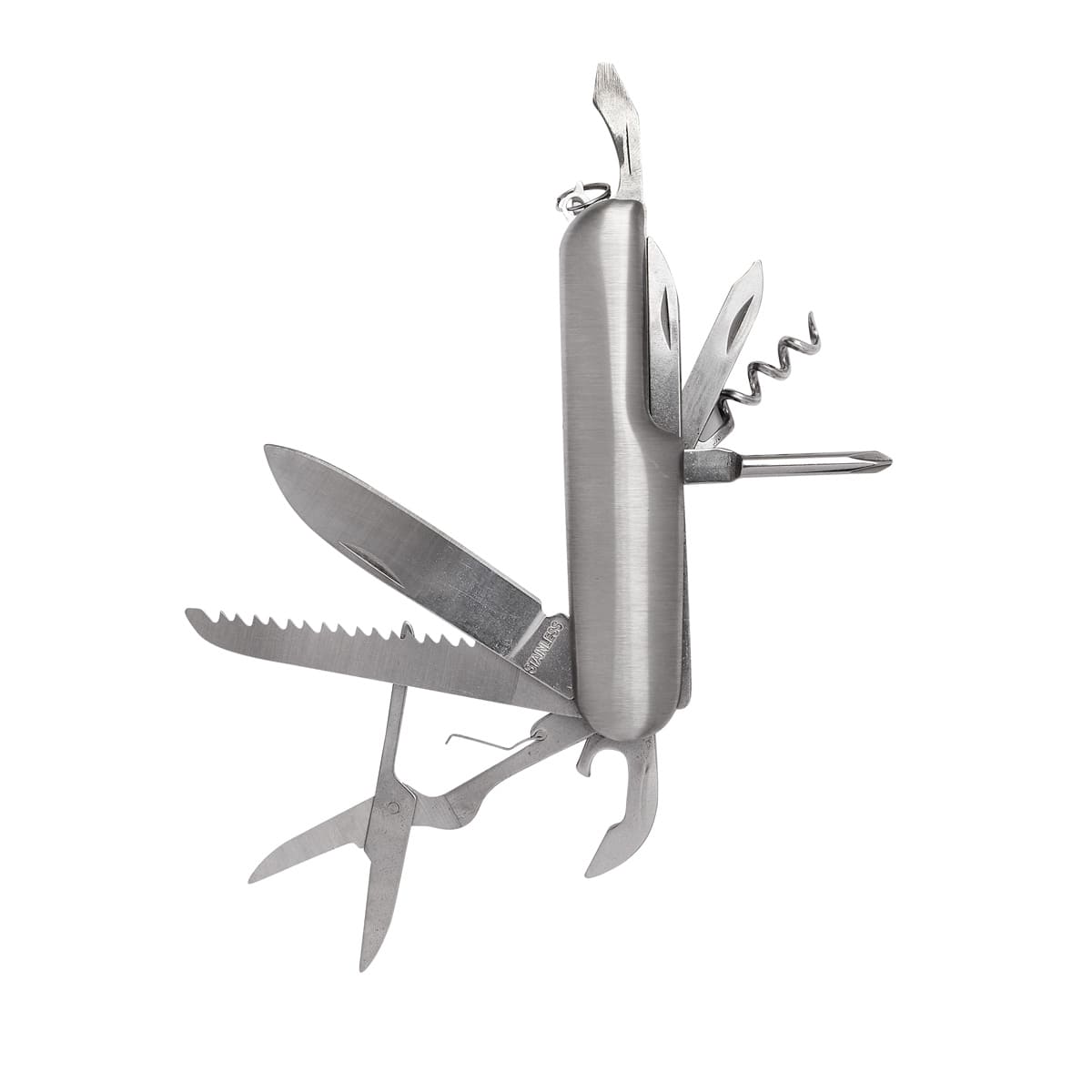 Navaja metálica compacta y resistente. Incluye 9 funciones: Tijeras, navaja, sierra para madera, abrelatas, destornillador plano y de cruz, destapador, lima, punzón plano, sacacorchos y aro para llavero. Combina versatilidad y durabilidad, diseñada para superar cualquier desafío. Incluye caja individual.. Medidas: 2.5 x 9 x 1.7 cm . Material: Metal