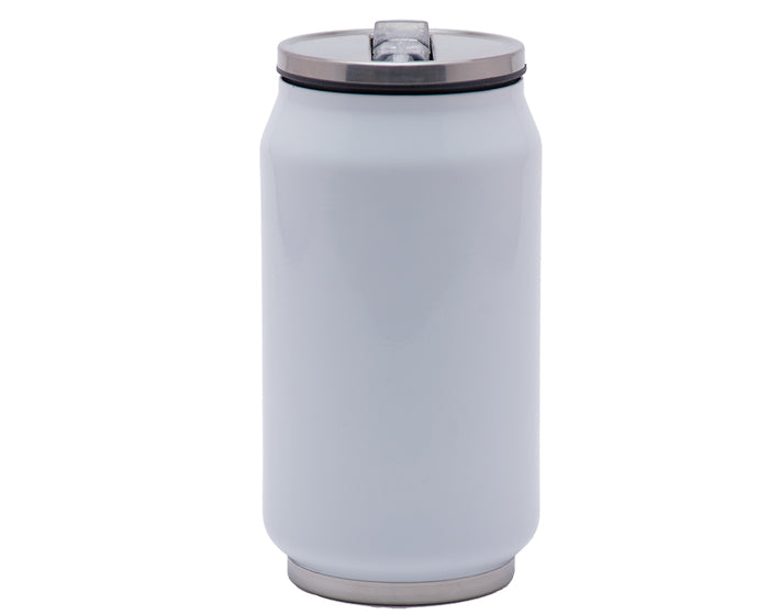 Singular termo en forma de lata de acero inoxidable con doble pared. Envasado al alto vacío, tecnología que permite mantener las bebidas calientes por 12 horas y frías por 24 horas. Cuenta con tapa hermética de rosca y boquilla plegable para beber. CAP. 300 ml. Presentación: caja en color blanco. Temperatura y Tiempo sugeridos para sublimar: 195 grados 45 seg.