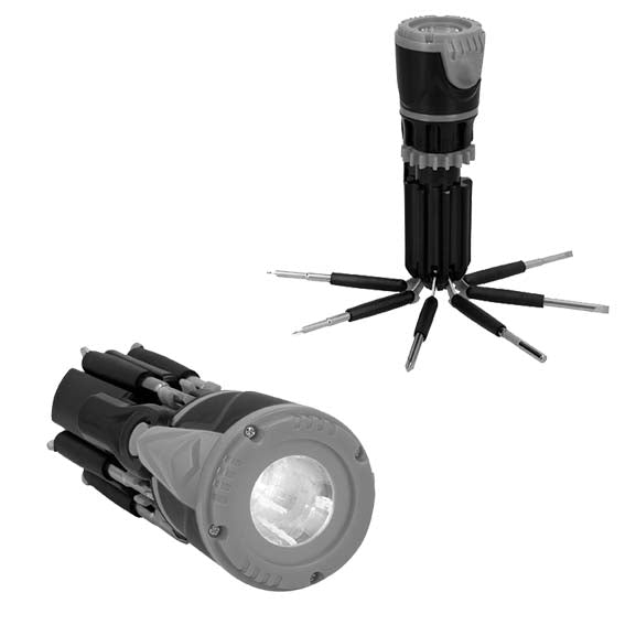 Multi-herramienta con lámpara 12 en 1, incluye desarmadores, cuerpo de plástico con clip y flexómetro. Utiliza 3 baterías AAA no incluidas.. Medida producto alto: 15.5 . Medida producto ancho: 5.1 . Area impresion: 2 x 1.5 cm