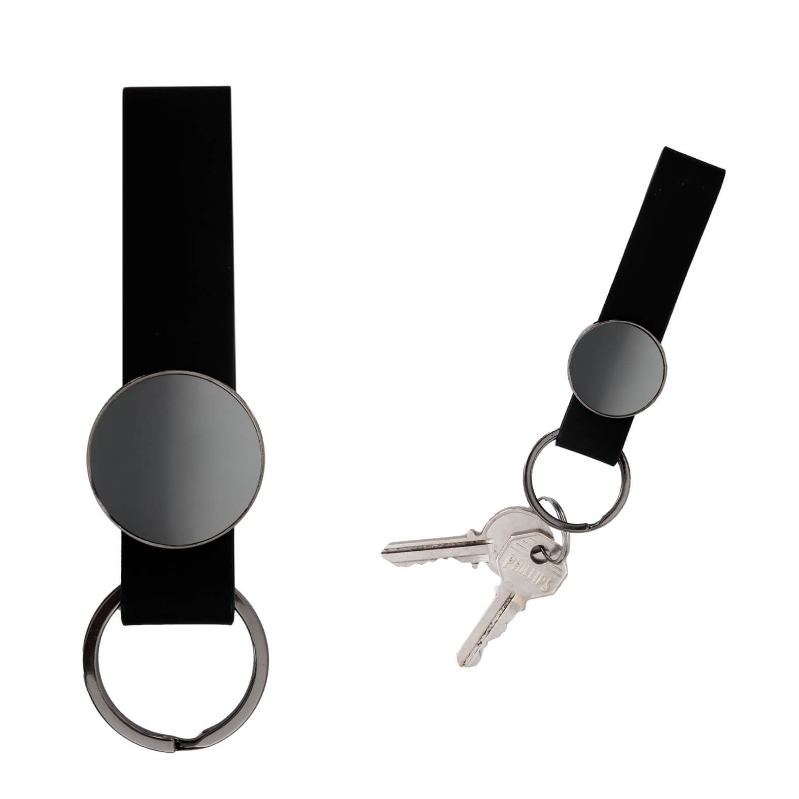 Llavero metálico con correa de curpiel y círculo con acabado espejo.. Medida producto alto: 2.9 . Medida producto ancho: 11.7 . Area impresion: 2 x 2 cm