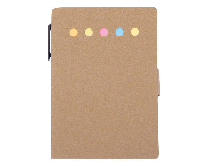 Estuche de papel reciclado con block de hojas blancas y banderas adhesivas, incluye bolígrafo de papel reciclado.