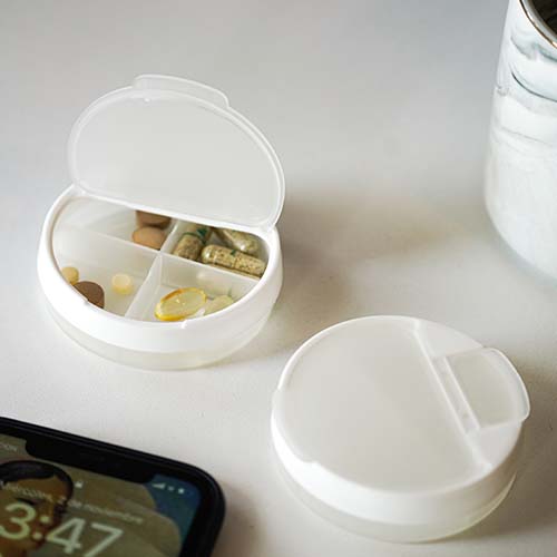 Pastillero de plástico con 4 compartimentos, 2 broches, tapa traslúcida y parte superior giratoria.. Medida producto ancho: 6.7 . Area impresion: 3 cm Diámetro