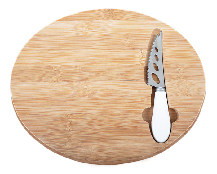 Tabla de quesos de bambú ovalada con ranura para cuchillo. Incluye: 1 cuchillo de acero inoxidable con mango de cerámica. Presentación: caja en color blanco.