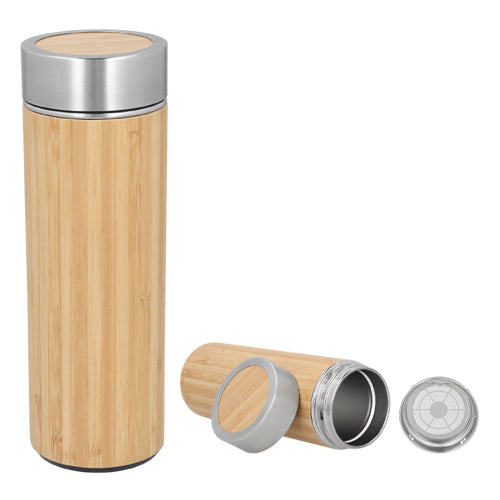 Termo con doble pared de acero inoxidable y exterior de bambú, con colador y tapa metálica enroscable.. Medida producto alto: 20.8 . Medida producto ancho: 7 . Area impresion: 7 x 10 cm