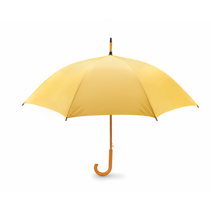 Paraguas fabricado de poliéster 190T, de apertura automática, con eje, puntas y tapa de madera. Varillas de metal chapado en negro. Mango de madera curvado acabado natural. Mide 23.