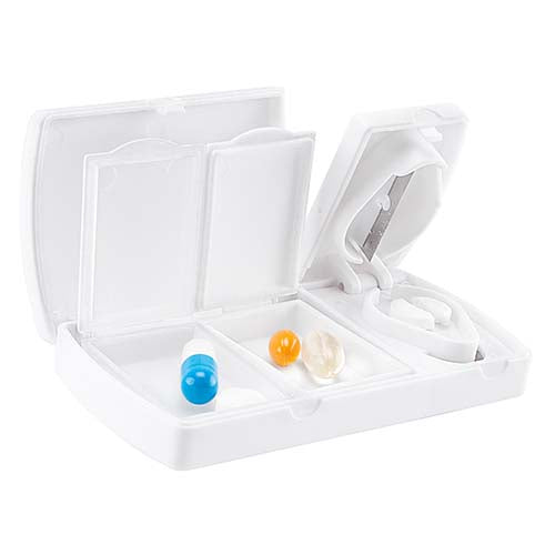 Pastillero con corta pastillas y 2 compartimentos separables.. Medidas: 9.5 x 4.7 cm . Material: Plástico