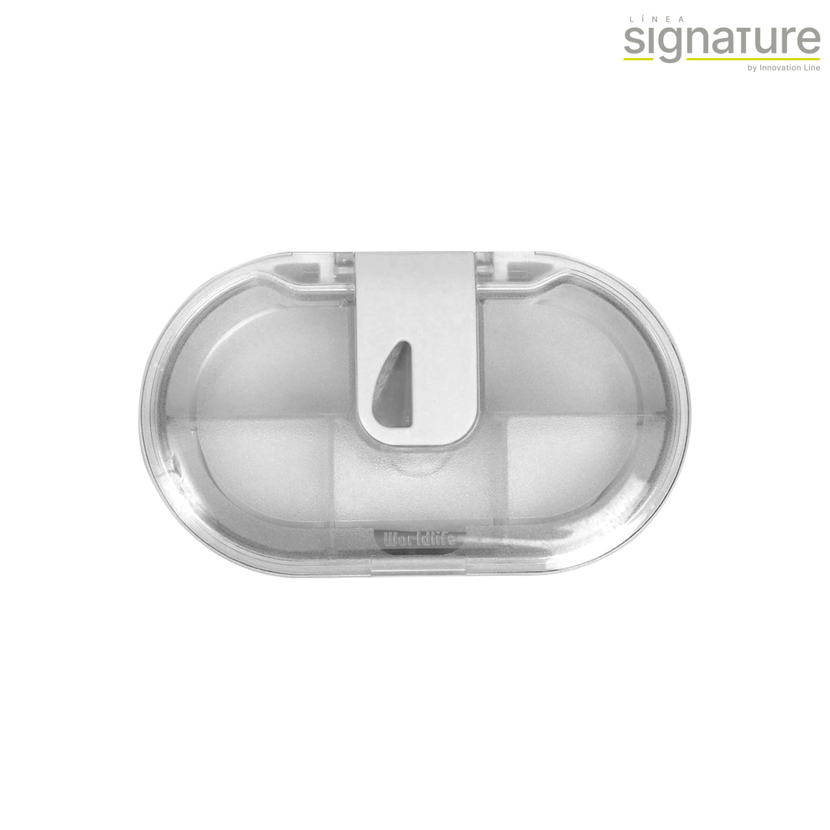 Pastillero con forma ovalada, fabricado en plástico AS acrilonitrilo estireno, con cortador de acero inoxidable y 5 compartimentos.