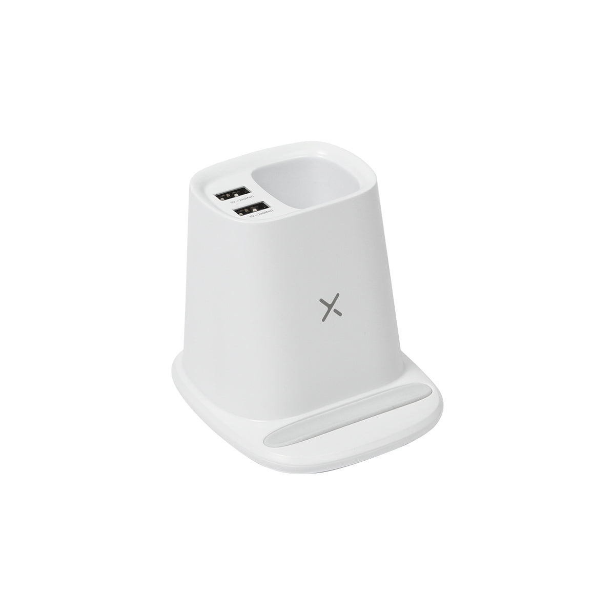 Porta lápices multifuncional fabricado en plástico ABS, con cargador inalámbrico tecnología WPC Qi v1.2.4, soporte de silicon para teléfono celular, dos puertos usb, ventilador, lámpara led y entrada de carga tipo C. Incluye caja de cartón individual.