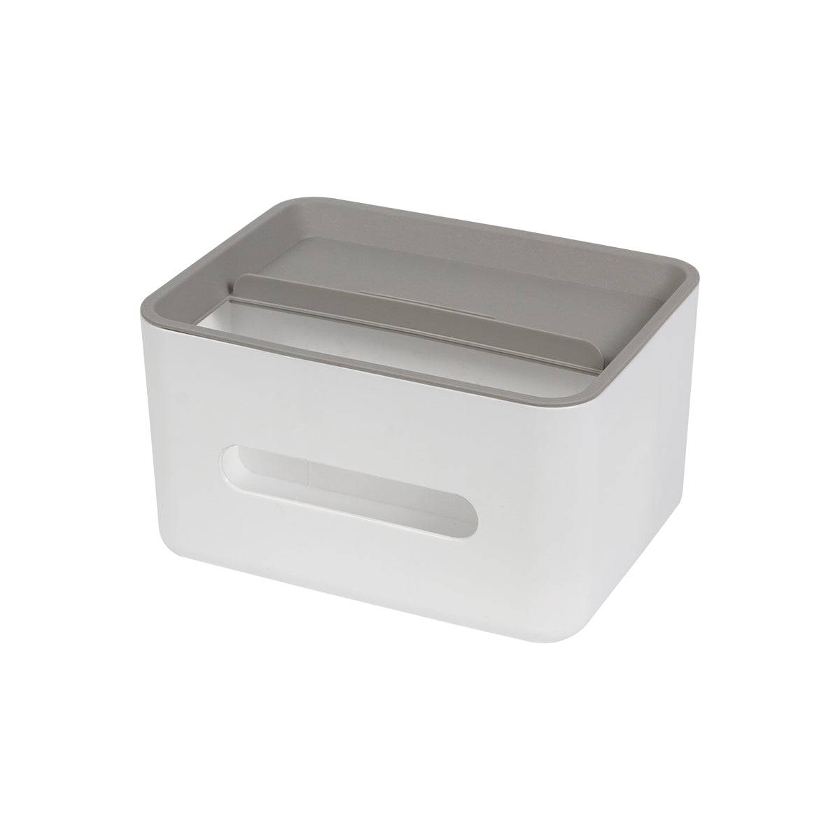 Porta pañuelos desechables con porta celular y compartimentos para almacenaje, fabricado en plástico PP. Es ideal para almacenar varios artículos de papelería o personales. La solución perfecta para organizar y llevar tus artículos de papelería o personales de manera ordenada y conveniente.