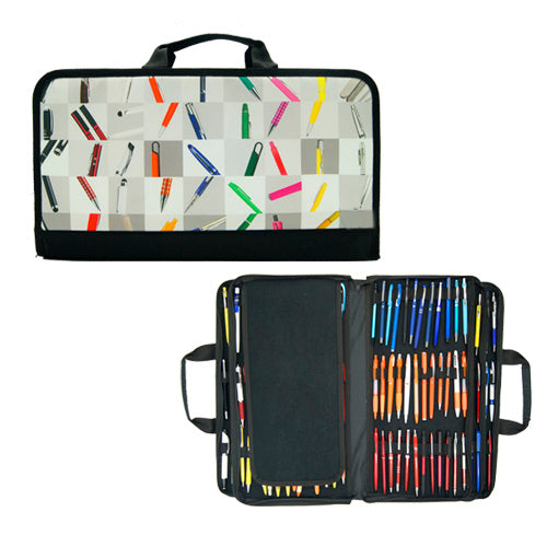 Estuche de poliéster con asas, 6 compartimentos, 3 ventanas protectoras y 3 cierres. Con espacio para 216 bolígrafos. INCLUYE 202 BOLIGRAFOS.. Medida producto alto: 28 . Medida producto ancho: 50 . Area impresion: 48 x 22 cm