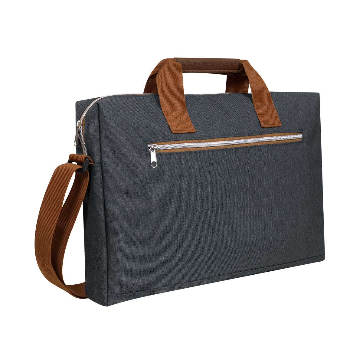 Portafolio con diseño compacto y ligero. Sus asas con detalles de curpiel, proporcionan un agarre cómodo y sofisticado. La bolsa principal con cierre tiene un compartimento para laptop de hasta 15 y un espacio adicional específico para tus pertenencias. La bolsa frontal es perfecta para artículos más pequeños. Además, la banda en la parte posterior facilita el transporte en trolley, brindándole aun mayor versatilidad y comodidad para su desplazamiento.. Medidas: 42 x 32 x 10 cm . Material: Poliéster / Curpiel