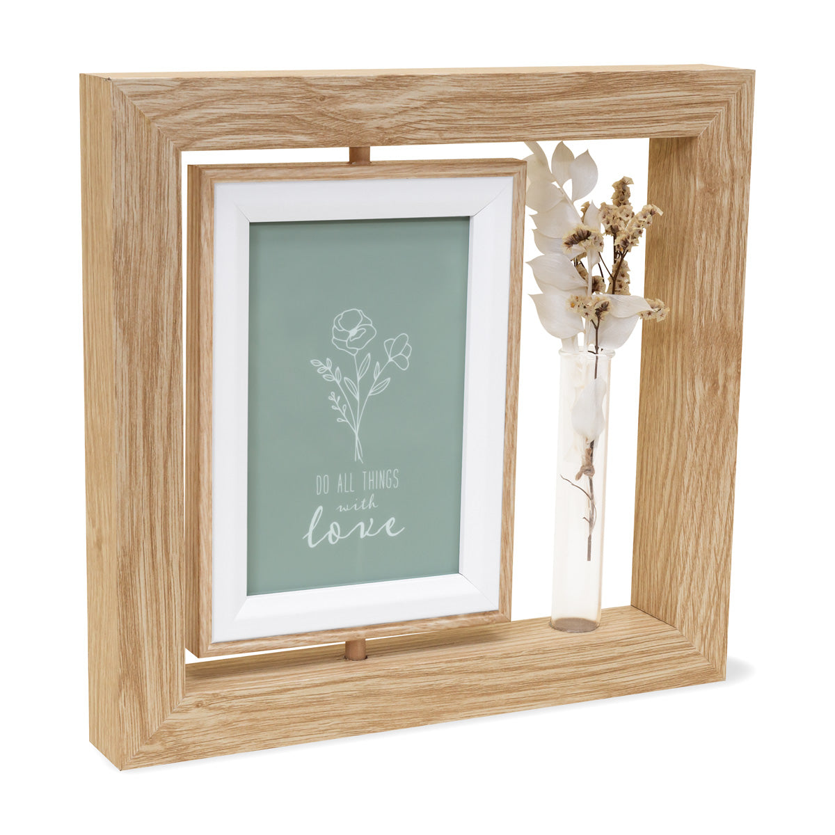 Su diseño elegante y atemporal, resaltará la belleza de tus fotos favoritas. Contiene un marco giratorio, con capacidad para fotografías de 10 x 15 cm y un recipiente de vidrio con flores secas. Añade un toque cálido y natural a tus espacios. Incluye caja individual.. Medidas: 26 x 24.7 x 3.5 cm . Material: MDF / Vidrio / Flores Secas