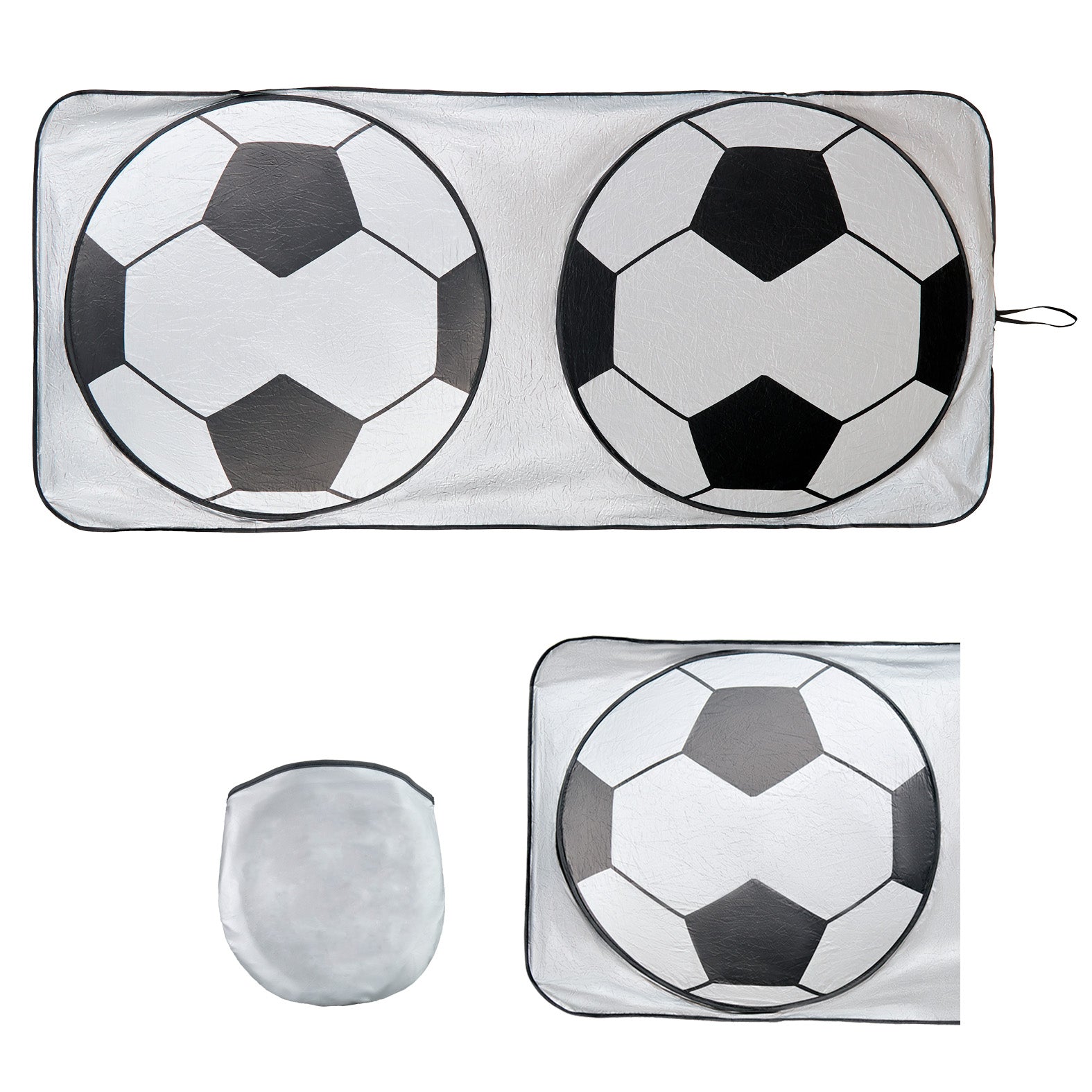 Parasol panorámico plegable de poliéster para auto con impresión de balón y funda para guardar.. Medida producto alto: 65.5 . Medida producto ancho: 150.5 . Area impresion: 35 x 10 cm