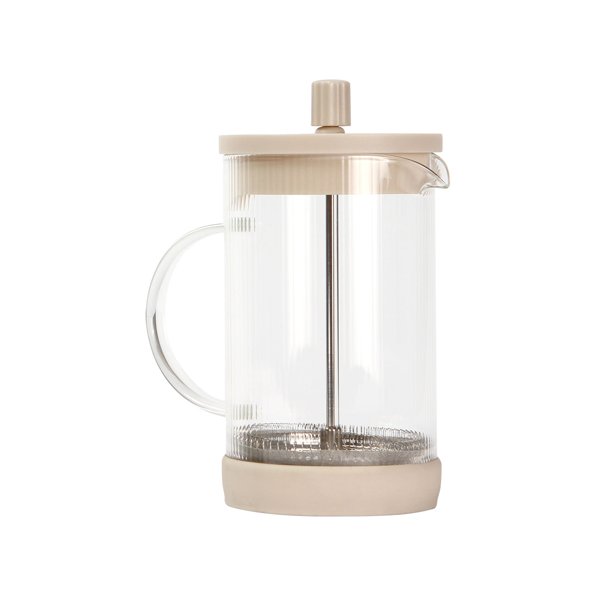 Prensa francesa de 800 ml, cuerpo fabricado en vidrio de borosilicato y acero inoxidable con tapa fabricada en polipropileno. La parte de abajo está fabricada en plástico tipo TPR  característico por su flexibilidad, durabilidad, además, es removible para fácil limpieza.