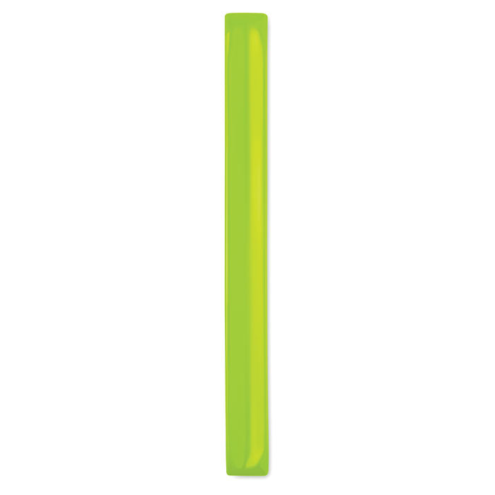 Pulsera enrollable fabricada de PVC color neón con reflejante de seguridad. El frente es reflejante y el reverso es de terciopelo negro.