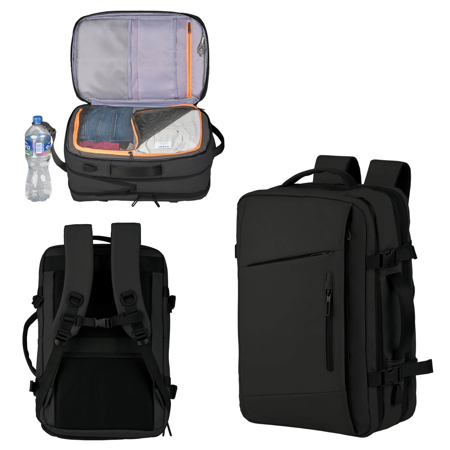 Mochila con compartimento principal de malla con cierre, puerto USB, organizador interno, cierre extensible para ampliar la capacidad, con broches ajustables, compartimento trasero con porta laptop de 17, tres bolsas frontales con cierre, respaldo acolchado con bolsa de seguridad y banda elástica, además de asa superior y lateral.. Medida producto alto: 29.5 . Medida producto ancho: 44 . Area impresion: 10 x 10 cm