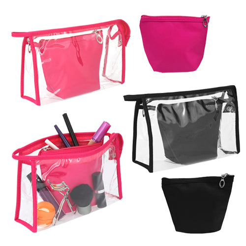 Cosmetiquera de plástico con cierre, asa y broche, que en el interior incluye mini cosmetiquera de poliéster con cierre.. Medida producto alto: 16 . Medida producto ancho: 23 . Area impresion: 10 x 7 cm