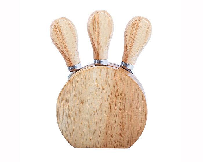 Juego de utensilios para cortar queso o carnes frías con mango y base de madera. Incluye: cuchillo, espátula, y tenedor de acero inoxidable. Presentación: caja en color blanco.
