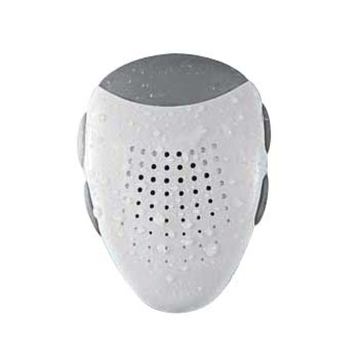 Radio FM fabricado de material a prueba de agua para uso en regadera o actividades acuáticas con bocina al frente y botones a los costados en color gris.