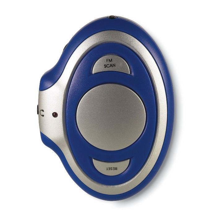 Radio FM portátil fabricado en plástico color gris plata con botón de búsqueda automática de estación y cinta elástica color negro para el brazo. Ideal para correr y ejercitarse con audífonos incluidos. Cuenta con luz roja en la parte superior.