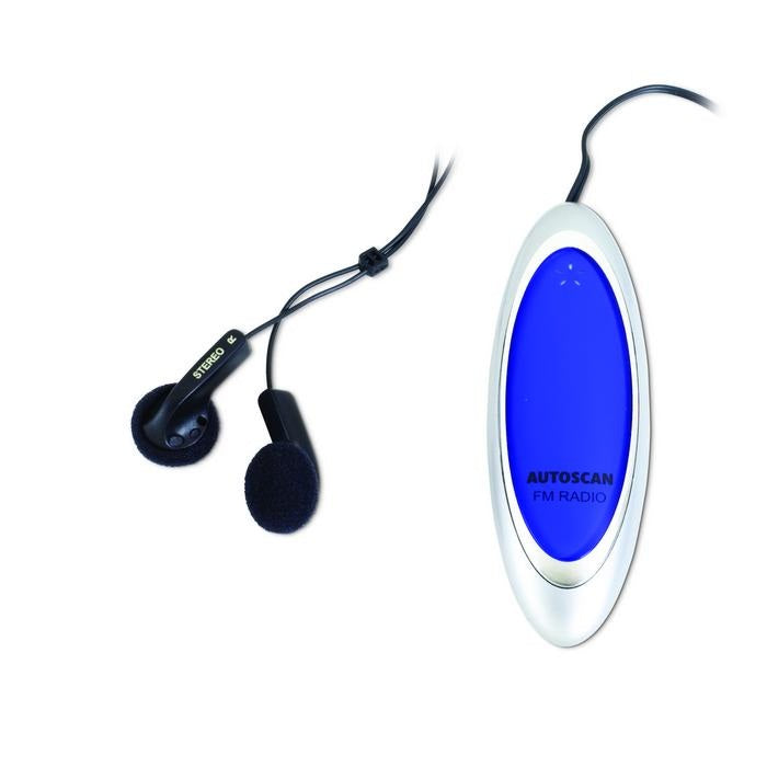 Radio FM portátil fabricado en plástico color plata de forma ovalada con audífonos integrados, clip en la parte trasera para sujetarse y botones laterales de búsqueda automática de estación, control de volumen y reinicio.