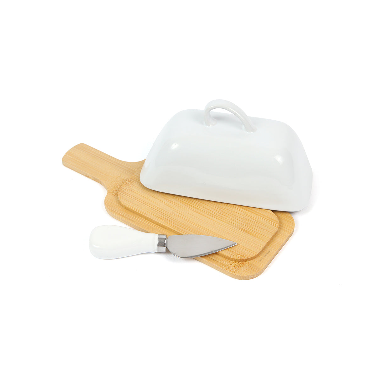 Recipiente para barras de mantequilla fabricado en madera de bambú acabado en laca con tapa de cerámica con agarradera, incluye un cuchillo untador. y una caja individual. La combinación de la cerámica y madera vuelven este recipiente una opción elegante para tu cocina