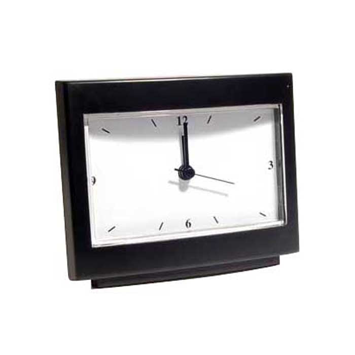 Reloj analógico fabricado en plástico color negro con forma de rectángulo.