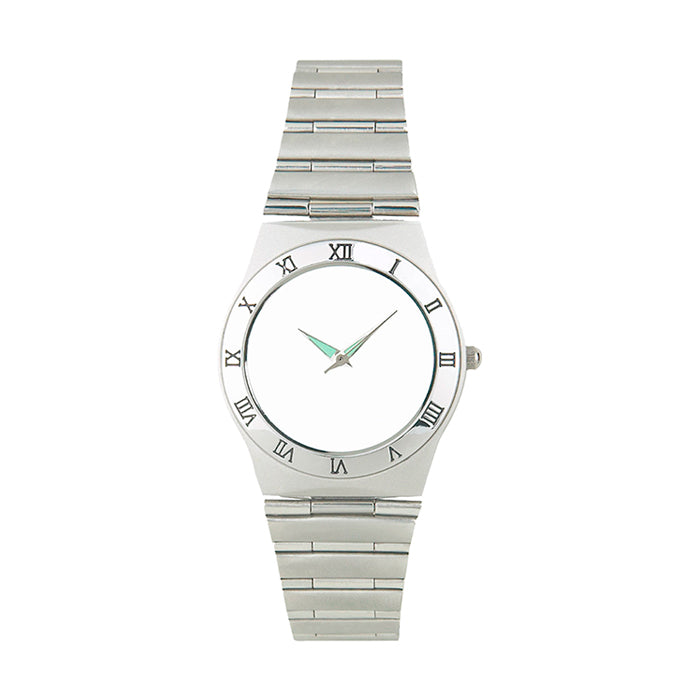 Reloj metálico con números romanos grabados en el bisel y maquinaria metálica japonesa. Incluye estuche metálico individual.
