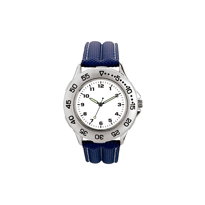 Reloj con caja metálica, dial en arillo giratorio y correa de plástico. Incluye estuche metálico.