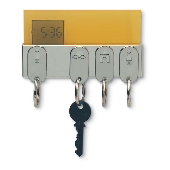 Reloj digital con pantalla LCD fabricado en plástico color amarillo con porta llaves de metal de cuatro argollas en la parte inferior.