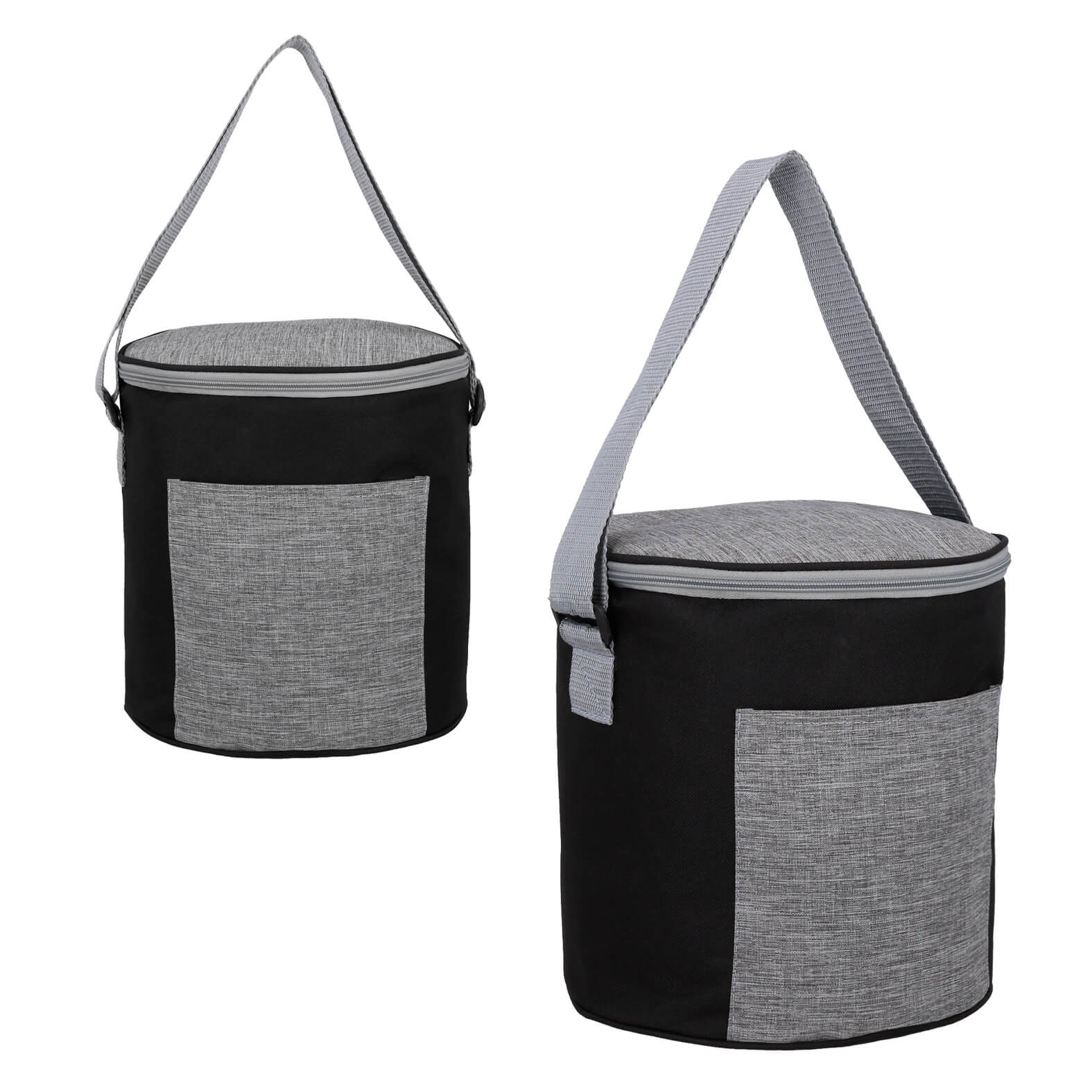 Hielera circular de poliéster con interior plástificado, bolsa frontal y correa ajustable.. Medida producto alto: 25 . Medida producto ancho: 23.5 . Area impresion: 10 X 8 cm