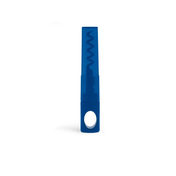 Sacacorchos fabricado de metal con estuche cilíndrico de plástico traslúcido.