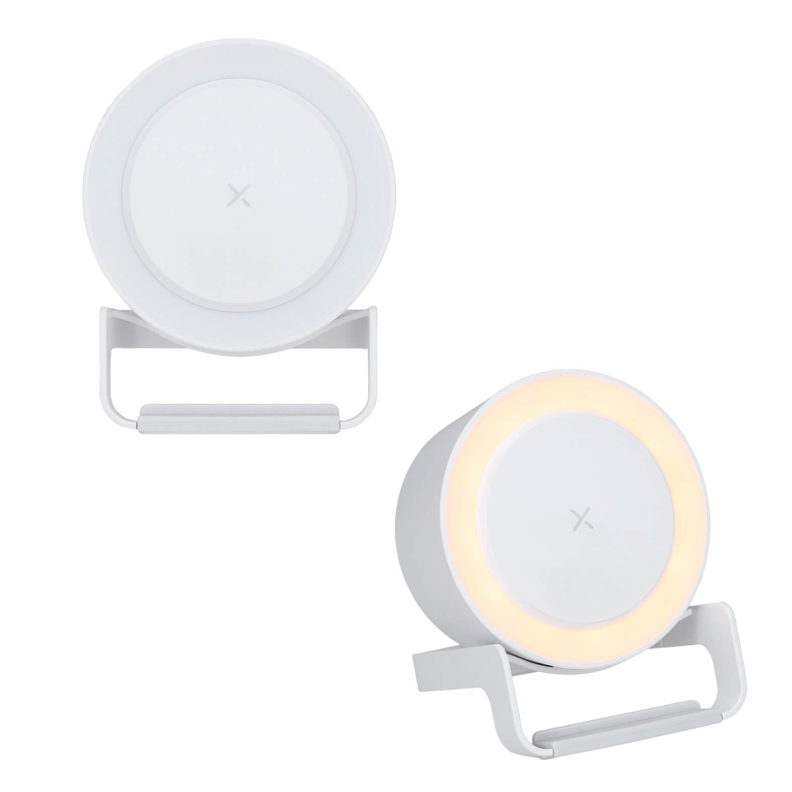 Bocina inalámbrica con wireless charger y luz LED con tres tipos de intensidad.. Medida producto alto: 6 . Medida producto ancho: 11 . Area impresion: 3.5 x 2 cm