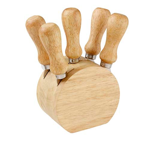 Set de madera, con 1 base con 4 cuchillos y 1 tenedor para quesos. La madera es un producto natural el cual puede presentar variaciones en tonalidades y vetas.. Medidas: 9.2 x 14.9 cm . Material: Madera Caucho / Metal