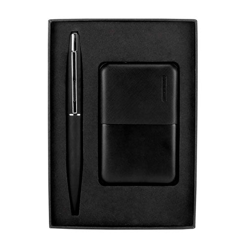 Incluye batería auxiliar de 5,000 mAh, bolígrafo de tinta negra con USB de 4 GB y caja de regalo.. Medidas: 6.4 x 9.8 cm Power Bank / 1.3 x 14.5 cm Bolígrafo . Material: Plástico Power Bank / Acero Inoxidable Bolígrafo