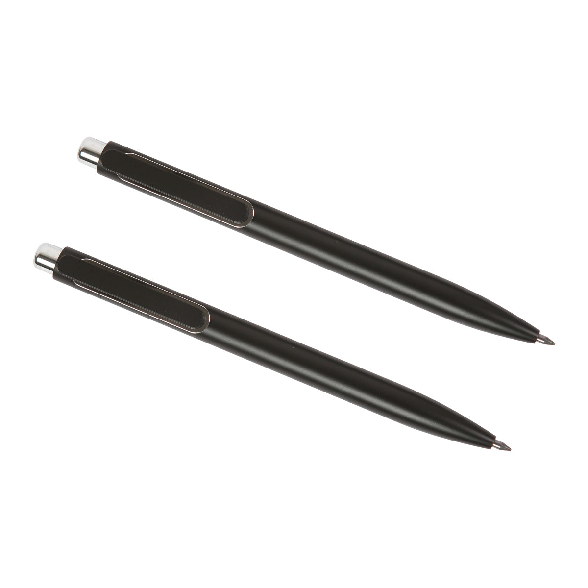 Juego de bolígrafo con tinta negra y lápiz tipo bolígrafo con punta infinita, ambos fabricados en aluminio. Elegante set de escritura que incluye una caja de presentación en papel negro. Estilo e innovación en un solo paquete.