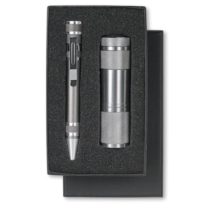 Juego de herramientas con linterna de 9 LED y multiherramienta fabricados de aluminio en forma de bolígrafo. Incluye 3 cabezas de desarmador ranuradas y 3 Phillips. 3 pilas AAA excluidas. Presentado en caja.